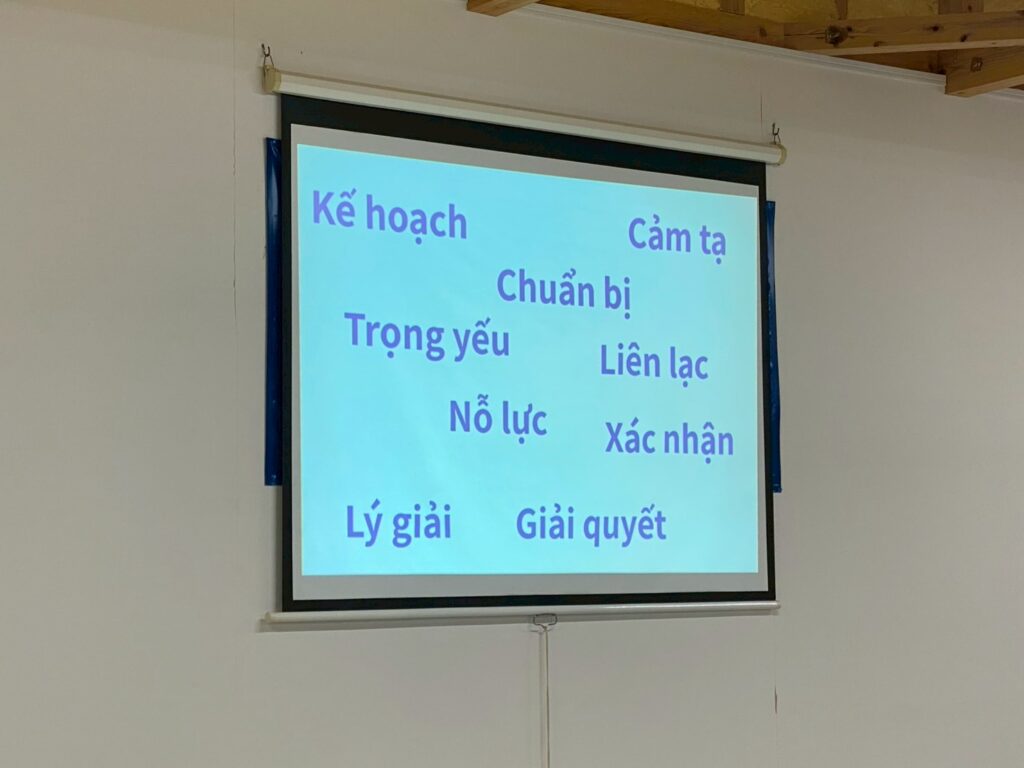セミナーの冒頭では、ベトナムのおすすめ料理の話題や、ベトナム語の中にある「漢越語」と日本語との共通点探しなどが行われました。母国との意外な繋がりに驚いたり、馴染みのある話題で盛り上がったりするうちに、実習生たちの緊張もすっかりほぐれたようです。