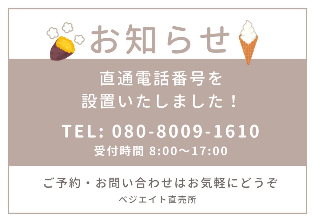日頃よりベジエイト直売所をご愛顧いただき、誠にありがとうございます。 この度、お客様からのご要望にお応えし、お問い合わせ・ご予約専用の直通電話を設置いたしました。 これまでお問い合わせの際にご不便をおかけしておりましたが […]